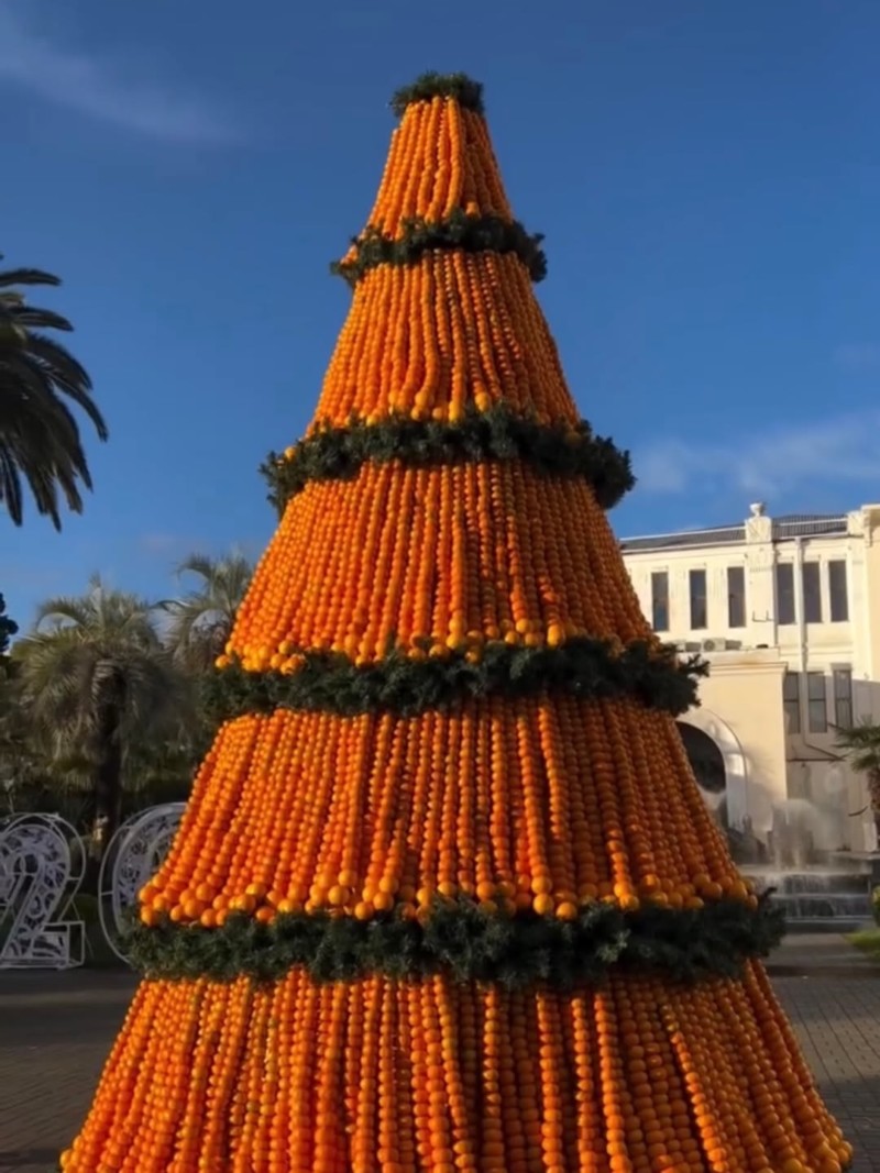 На площади перед Абхазским драмтеатром установили новую елку из мандаринов и апельсинов. Ее высота — более 5 метров, что стало мировым рекордом. На создание елки ушло 1,5 тонны мандаринов и 300 кг апельсинов.
