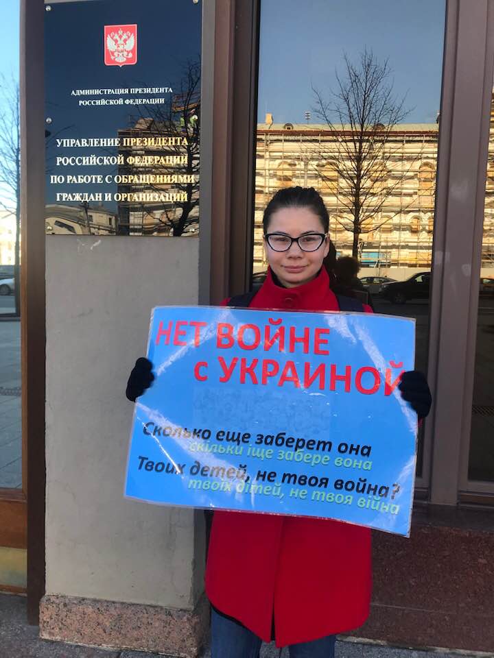 Пофасовали продукты и прибежали на пикет против войны с Украиной. А там -Лиза Зорина в красном пальто и красной надписью НЕТ ВОЙНЕ С УКРАИНОЙ стоит. И люди к ней подходят, и читают, и я всегда думаю с тайной надеждой -ну вот вдруг ещё кто-то, прочитавший, хотя бы подумает, что война, а особенно война с Украиной, — грех тяжкий, ужасающий, безумный…