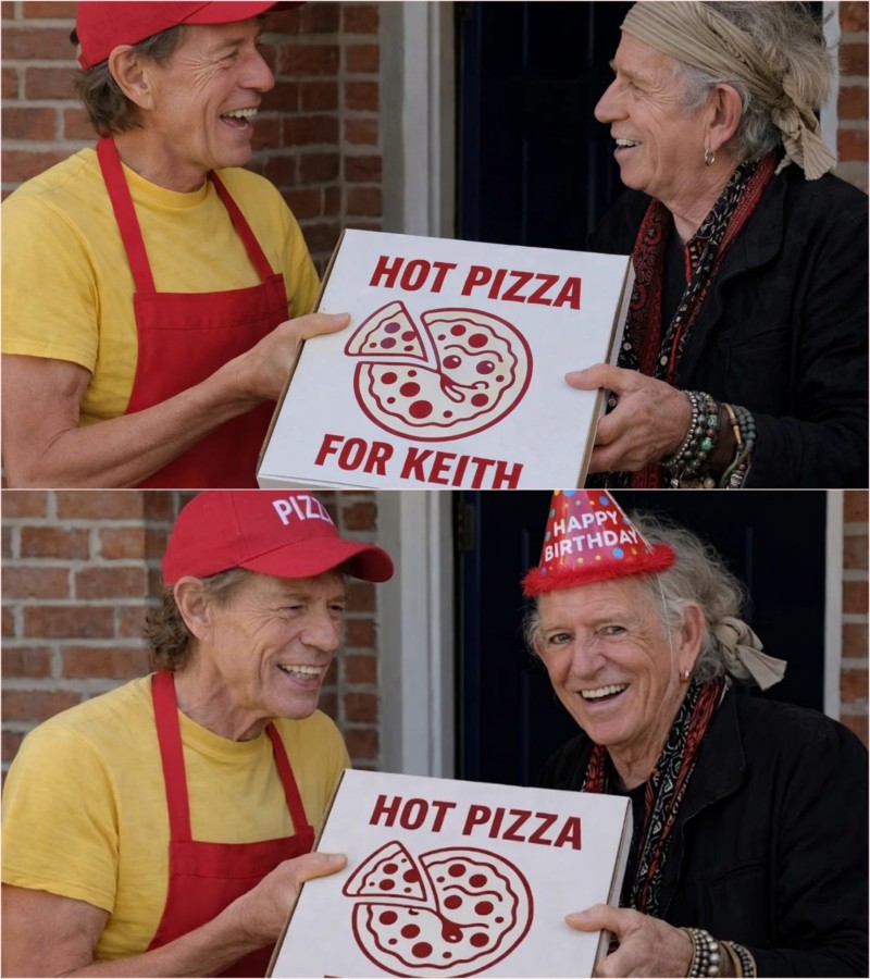 Мик Джаггер нарядился доставщиком пиццы, чтобы устроить Киту Ричардсу вечеринку-сюрприз на день рождения — тихо планировался три месяца и так хорошо справился, что Кит подумал, что это была какая Ни фанфар, ни стадиона, ни мигающих огней — просто маленький задний двор, гудящий смехом, историями и чистой энергией Rolling Ston
