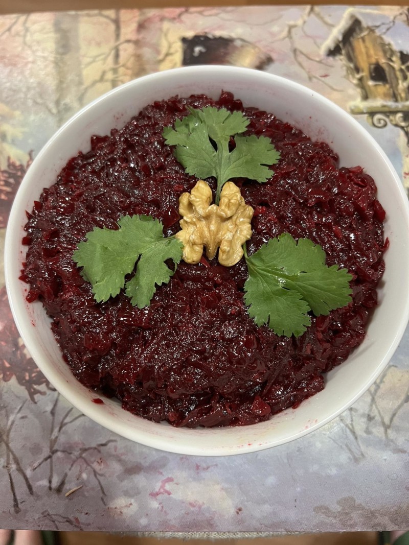 В идеале свеклу, помыв и не чистя завернув в фольгу запекаю в духовке примерно 1.5 часа. Так же, как для винегрета, шубы, гефилте-фиш и вообще любого употребления. Но можно, конечно, и сварить в воде со столовой ложкой сахара и половинкой лимона. Желательно, чтоб свекла оставалась аль денте. Или хотя бы не была переварена. Одновременно пассеруется на сковородке минимум (!) 1 кг мелко нарезанного репчатого лука, а лучше и чуть больше. При пассеровке лук присыпать парой ложек сахара, чуть карамелизуя. Далее свекла трется на КРУПНОЙ терке (только терка или овощерезка, блендер исключается!), вываливается в глубокую сковороду или сотейник с небольшим количеством растительного масла и ставится на большой огонь. Периодически помешивается. Должна выпариться вся жидкость и свекла должна начинать чуть приставать к сковородке. Только на этом этапе в нее вываливается пассерованный лук с маслом, на котором он пассеровался, при необходимости масла еще немного добавляется. Дальше только вопрос баланса вкусов: добавляется соль, черный перец, сахар, лимонная кислота (лучше, чем лимон), натертая цедра одного небольшого лимона и в самом конце — несколько зубчиков растертого с солью чеснока (по вкусу). Другие специи именно сюда не кладу. Когда вам уже очень вкусно — снимаете и — по банкам), сверху — чуть растительного масла. Можно как самостоятельную закуску, можно — как гарнир. Можно добавить грецкие орехи, кинзу и ложку майонеза при подаче, но мы не добавляем ничего. Если правильно обезвожена свекла .и сбалансирован вкус — за уши не оттянете!