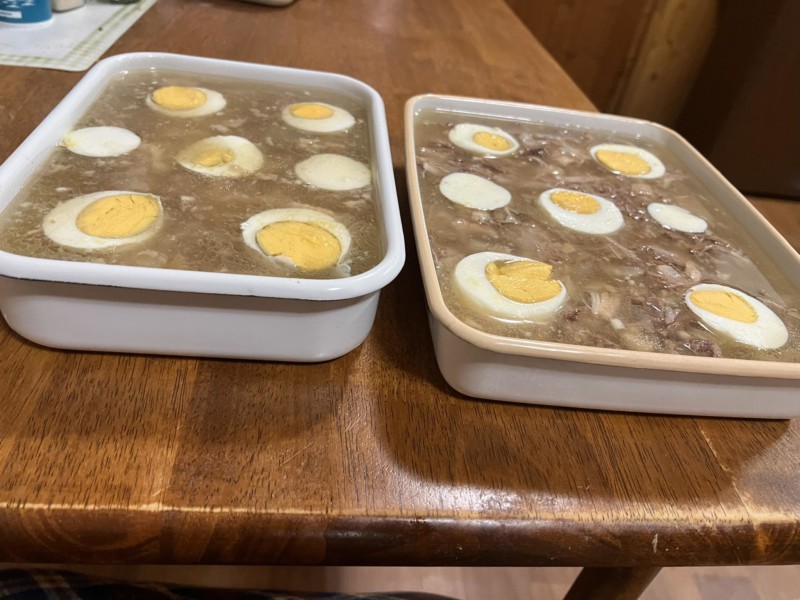 Крупный немолодой петух кусками в большую кастрюлю. Лапки обязательно, только с маникюром. Нутряной жир снять, не выбрасывать!Если петух килограмма 2,5-3 или больше, то больше ничего не надо. Если меньше, или курица, то добавить или копытце (телячье или свиное) или путовый сустав или кулек почищенных куриных лапок для клейкости. Желатин не признаю. Варить после закипания на самом маленьком огне с открытой крышкой в идеале часов 8. В последние пол часа можно положить прижаренную луковицу в кожуре, морковку и несколько зубчиков чеснока, лучше — если в марлевом мешочке и потом достать. Если подсолить, то чуть-чуть. Досолить (не до конца!), когда снимите с огня. Вытащить мясо, разобрать размером как любите. Только, ради бога, не рубить в кашу и тем более не прокручивать! С бульона по возможности снять жир (не выбрасывать, в баночку). Бульон процедить, он готов, если смоченные бульоном пальцы будут липнуть друг к другу. Тогда хорошо застынет. Залить им разобранное мясо. Добавить растертый с солью чеснок и только тогда довести до нужной солености. Разлить. Украсить кружками яиц в крутую. В идеале — нутряных яиц, без белка. Когда удается выпендриться еще больше украшаю отдельно отваренными с укропом и чесноком петушиными гребешками.